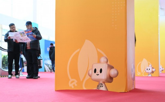 11月29日,链博会展厅入口处摆放着带有“链氪”形象的小花坛引导观展人群。