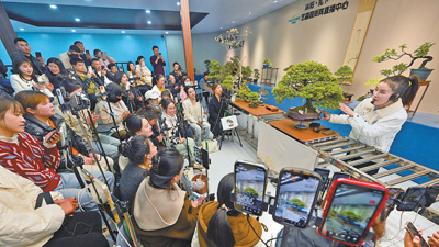 沭阳县扎下镇一处直播中心,电商主播近日在竞价销售花木盆景。